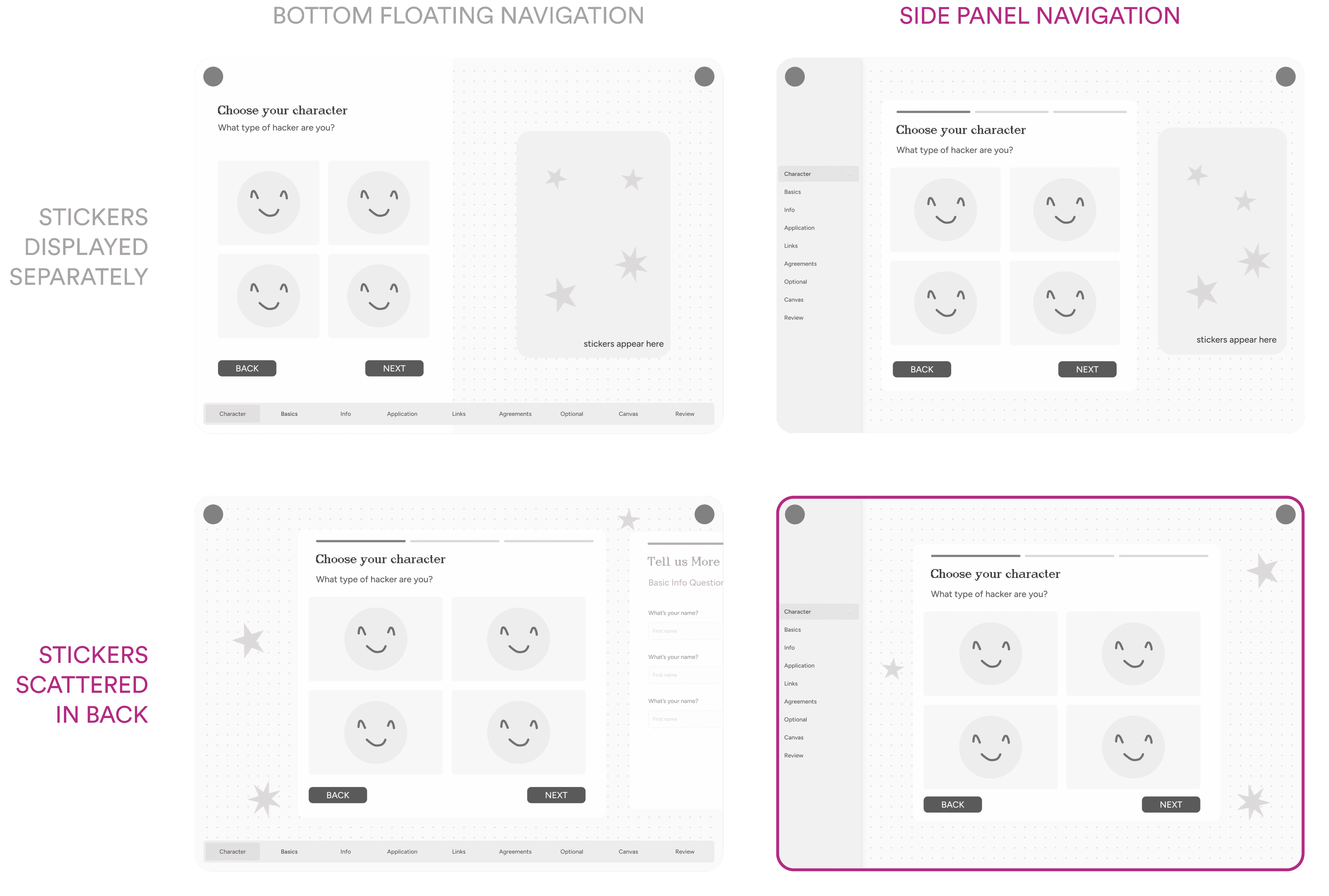 With side panel navigation, a fixed sticker book made the layout feel cramped, while scattered stickers better reinforced the sense of openness and creativity.