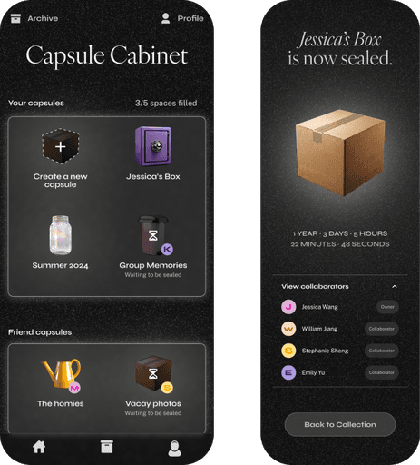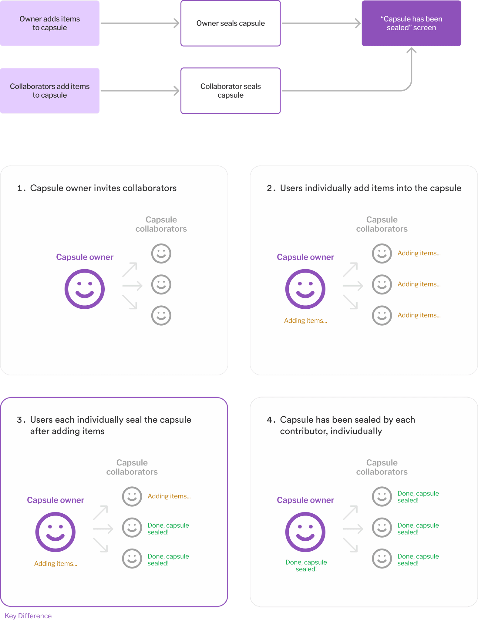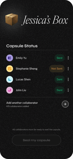 While both flows follow the same general process of adding items and sealing the capsule, they differ in who controls the final capsule sealing — either each contributor individually, or the owner on behalf of everyone. This distinction affects how ownership and coordination are experienced by collaborators.