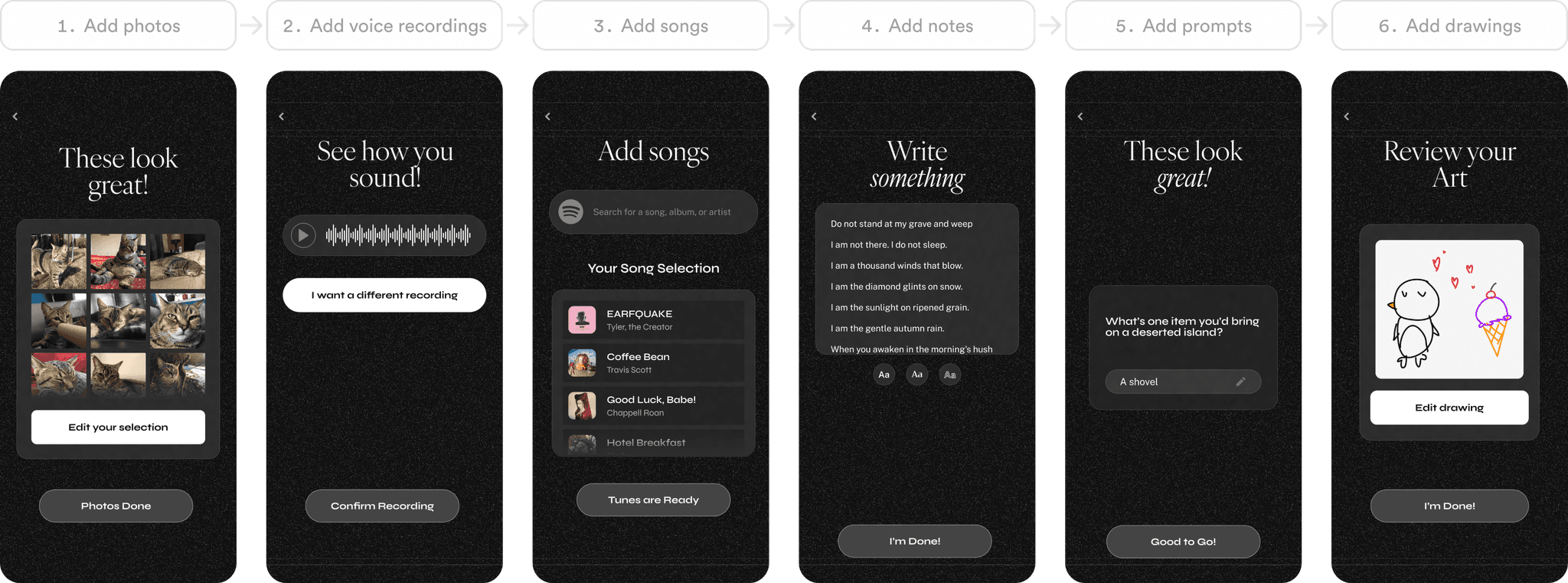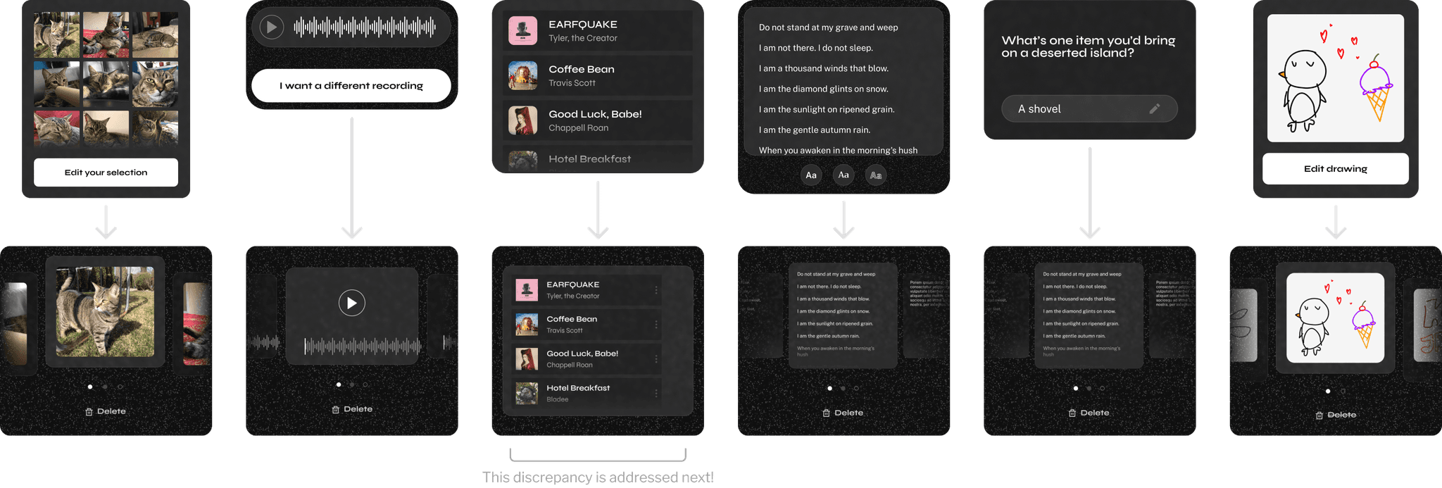 At every stage of the capsule creation, each media item would be added to a carousel. Users can add several items to a carousel, and delete existing carousel items. The carousel solution also reduced the complexity of managing existing uploaded media: users could easily view, edit, delete, or rearrange items within a consistent interface.