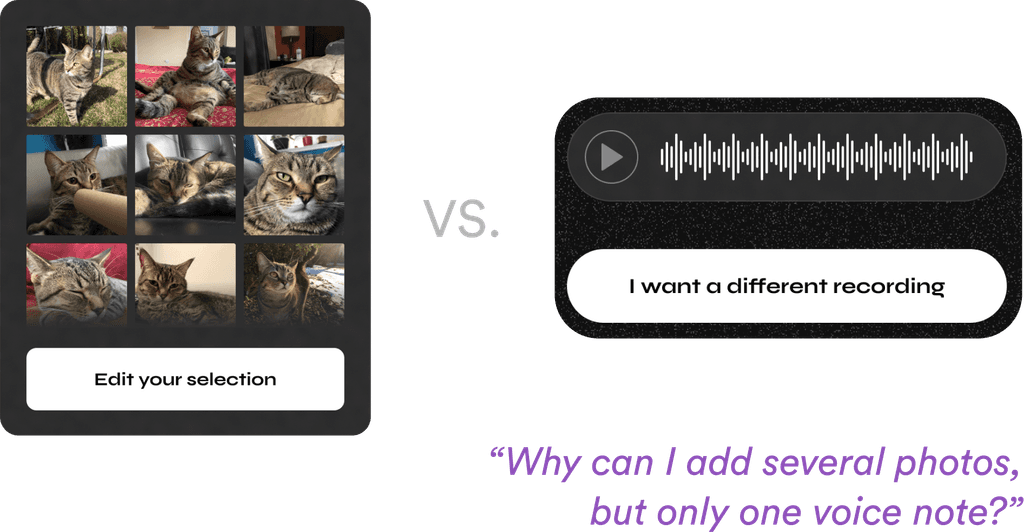 I designed the option to add several photos, but for the other media types, I assumed that the user could only add 1. But this doesn’t make sense, and doesn’t reflect a real-world time capsule.